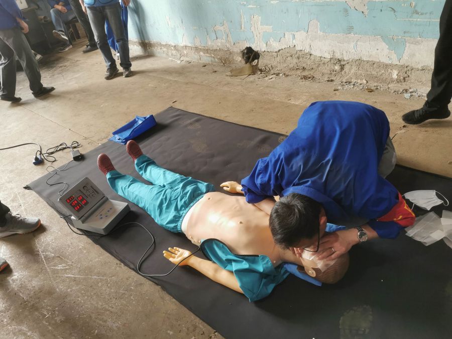 在有限空间应急救援环节,模拟有限空间突发职工缺氧窒息被困事故,相关应急预案随即启动,救援人员及时实施救援,对被困人员采取心肺复苏紧急措施,并送就近医疗机构进行急救。